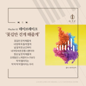 데이브레이크의 '꽃길만 걷게 해줄게'는 결혼식 퇴장곡으로 많은 사랑을 받고 있는 곡이에요. 밝고 경쾌한 멜로디와 희망찬 가사가 결혼식의 마무리를 화려하게 장식해줄 거예요. "우리 함께 꽃길만 걸어요"라는 메시지를 담고 있어, 앞으로의 행복한 인생을 약속하는 두 사람의 마음을 잘 표현하고 있죠. 예식 퇴장곡으로 이 곡을 선택하면, 모든 하객들이 함께 즐거운 마음으로 신랑신부를 배웅할 수 있어요. 특히 밝고 긍정적인 에너지를 전하고 싶은 커플에게 추천해요. 신랑신부가 퇴장할 때 이 곡이 흐르면, 결혼식장이 축제 분위기로 가득 찰 거예요.