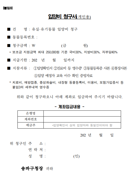 내장형 동물등록을 완료하고, 동물사랑배움터 교육을 이수합니다. 입양 후 발생한 지원 대상 비용을 지출하고 영수증을 보관합니다. 송파구청 문화예술과 동물복지팀에 신청서를 제출합니다. 신청서가 검토된 후, 익월 중으로 입양비 지원금이 지급됩니다.